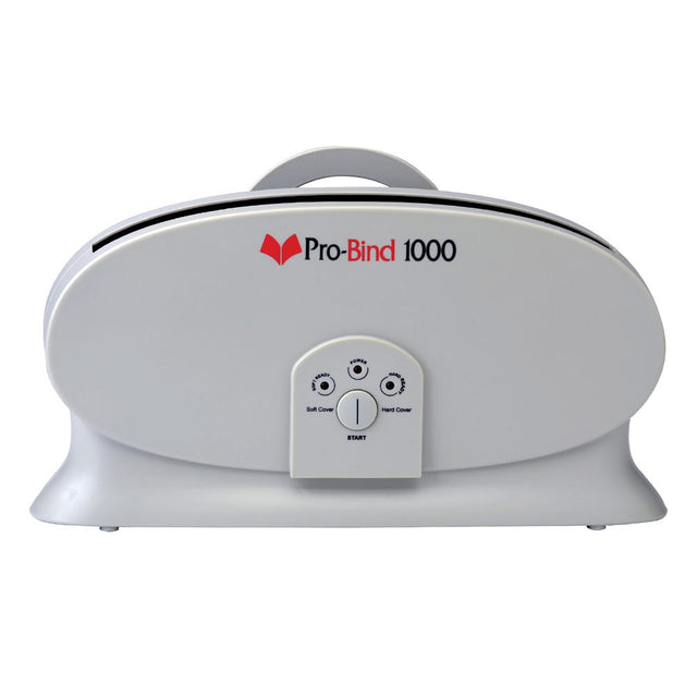 Thermal bind soft covers with a simple touch of a button! The Pro-Bind 1000 fits up to 3/4" spine and will accommodate one book at a time. This unit is designed for 11" x 8 1/2" sheet size or smaller and is the junior version of the Pro-Bind 2000. This lightweight system is portable to fit any office needs and only weighs 2 pounds. Other benefits of the Pro-Bind 1000 include an automatic energy saving mode when the unit is not being used as well as factory heat settings that minimize operator error. The Pro-Bind 1000 unit carries a one-year warranty. Please note: to bind hard covers with the PB-1000, you will have to run it through two cycles for a secure bind.