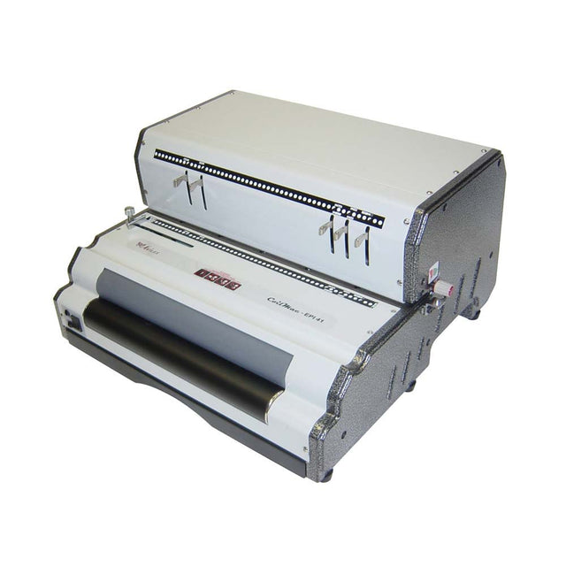 The Akiles CoilMac-EPI+ coil binding machine is a heavy-duty, all-electric binding machine capable of handling commercial-volume workloads. The CoilMac-EPI+ is equipped with a powerful electric punch that is capable of up to 25 sheets at once (based on 20 lb. paper) that uses Akiles' exclusive "Precision Guiding System" to ensure a clean, precise punch every time. The CoilMac-EPI+ also features innovative 4mm x 5mm oval punching dies, which make inserting coils and turning pages faster, easier, and more smooth than with traditional round dies. This model has 54 fully-disengaging dies as well as an open punching throat and continuous punching guide, which give it the ability to punch a wide variety of document sizes. The CoilMac-EPI+ has a full-length electric coil inserter that is designed for heavy-duty use, with an industrial-grade roller motor and foot pedal operation. The double-roller inserter is capable of inserting coils up to 7/8" in diameter (coils up to 2" in diameter can be inserted manually). The CoilMac-EPI+ is backed by a one-year manufacturer's warranty, and its durable, all-metal construction will provide you with years of trouble-free use. Free premium coil crimping tool is included. The CoilMac-EPI+ is compatible with all standard 4:1 pitch binding coils, including GBC Color Coils.