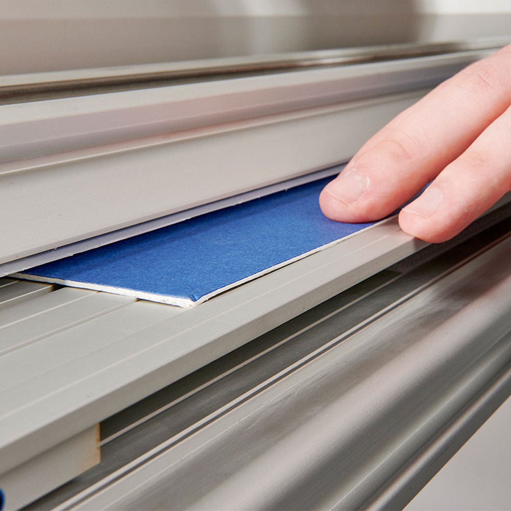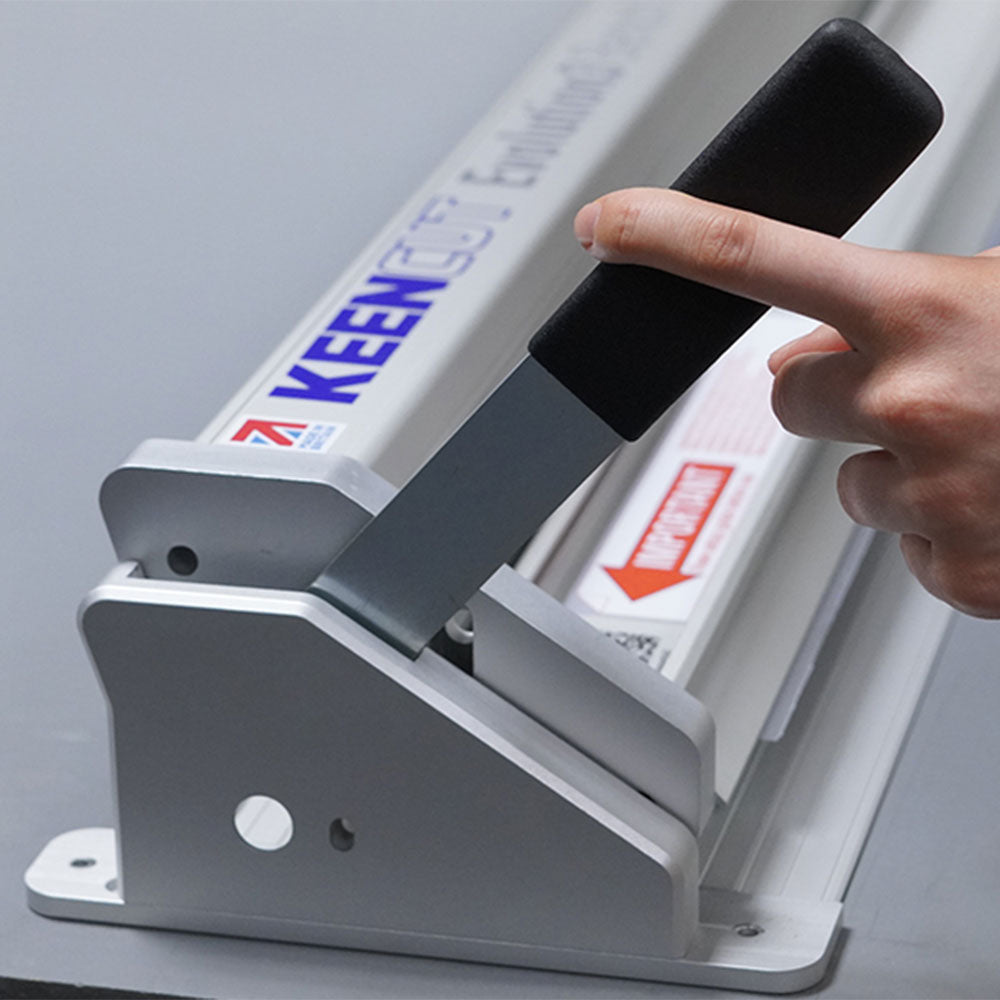 Keencut’s unique Lift-and-Hover (patent pending) technology enables single-handed, fast and accurate alignment of all material, irrespective of thickness. Lower the clamping bar and it hovers just above the material surface with zero sag, even on the full length 3.6m (144″) cutter. Use the sightline strip to see where the cut will be made, then fully engage the clamp – it’s so simple.