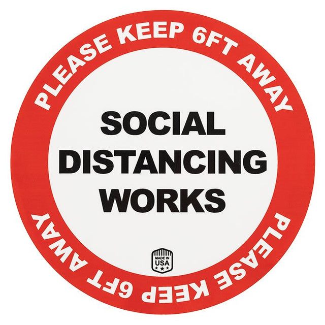 Maintain safe social distancing with bright and durable floor stickers made in the USA. The round, red and white, 10-inch decal clearly reminds the public that social distancing works and to keep 6-feet apart. It's an effective display option for crowded areas like businesses, warehouses, schools, restaurants, waiting lines, and more. The sticker's materials are made to withstand heavy foot traffic and can also be removed without damaging the surface. A non-slip coating is applied. The Social Distancing floor decal easily sticks to any hard surface like concrete, rubber, linoleum, marble, tile, and any other non-porous surface.